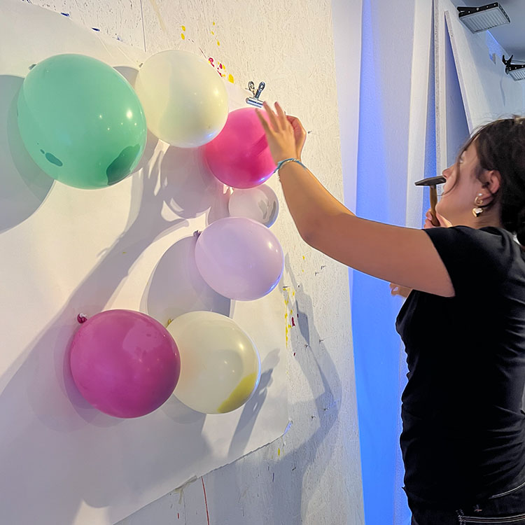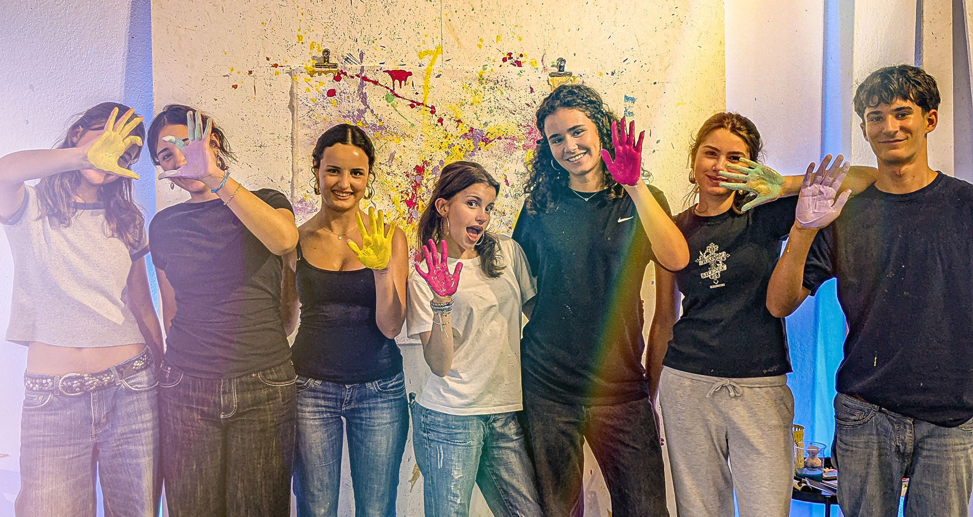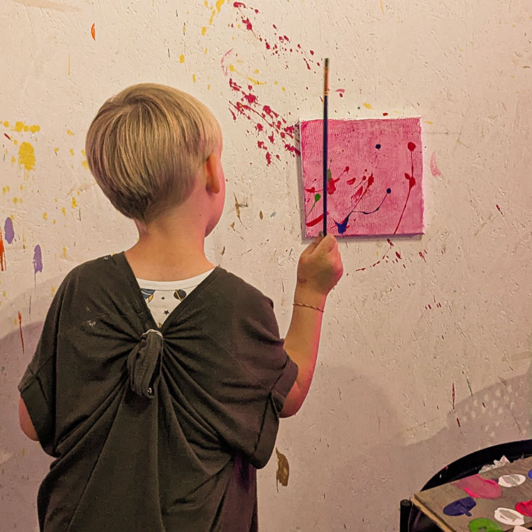 Ihr schleudert, spritzt und werft die Farbe auf große Leinwände. Jede Bewegung ist ein Statement – spontan, wild, befreiend.