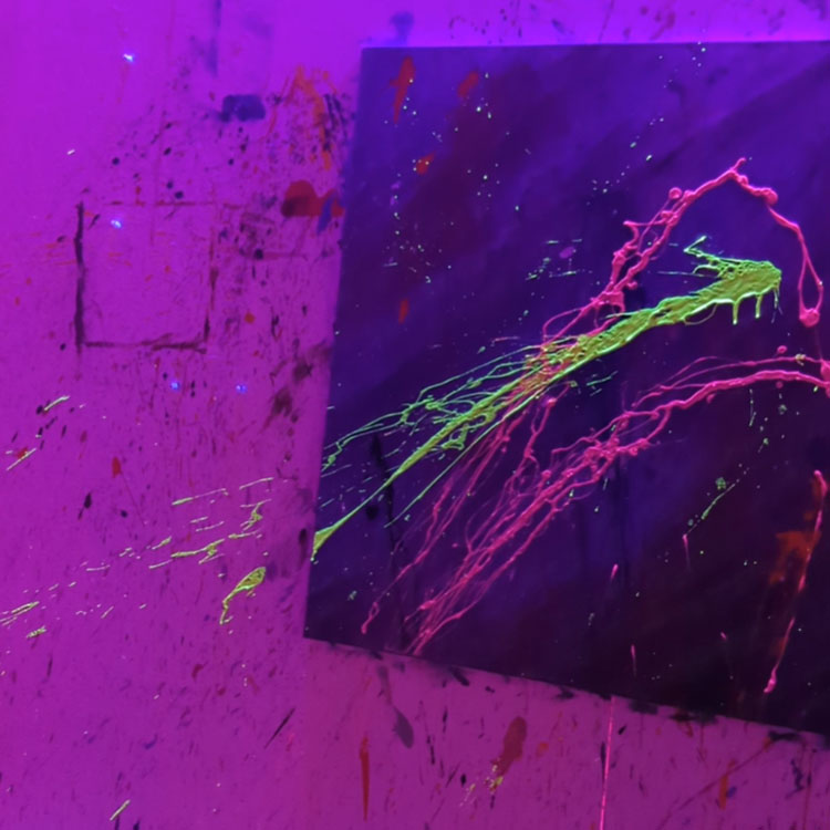 Beim Neon Action Painting dreht sich alles um Farben, die im Schwarzlicht zum Strahlen gebracht werden. Du splashst, tupfst, gestaltest und lässt deiner Kreativität freien Lauf. Erlebe, wie deine Kunstwerke im UV-Licht in ganz neuen Dimensionen erstrahlen.